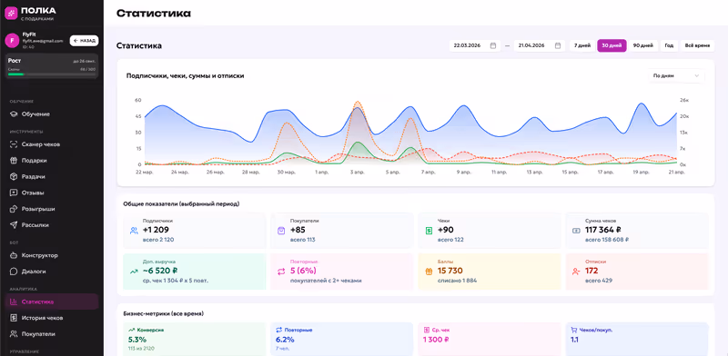 Баллы → подарки. Рассылки, розыгрыши и рефералы увеличивают повторные продажи.